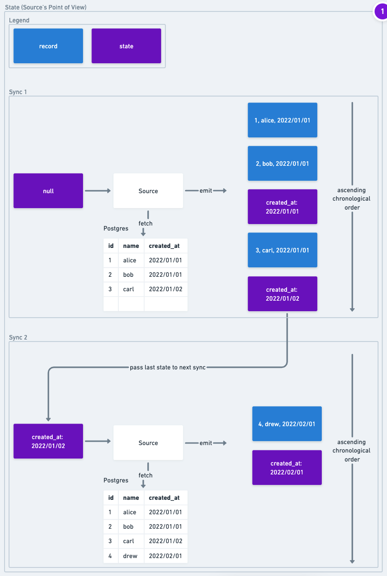 3. state - A JSON object that represents a checkpoint in the replication. This object is only ever written or read by the source, so it is a JSON blob with whatever information is necessary to keep track of how much of the data source has already been read (learn more in the State & Checkpointing Section).
